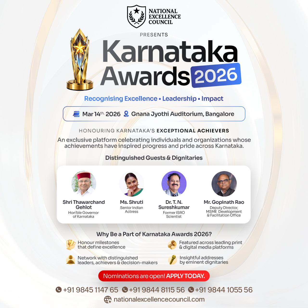 Karnataka Awards 2026 is a prestigious state-level recognition platform of the National Excellence Council (NEC), created to honour Karnataka’s exceptional achievers whose leadership and impact have contributed to the state’s progress. Scheduled for 14 March 2026 at the Gnana Jyothi Auditorium, Bangalore, the event will bring together distinguished leaders, industry pioneers, policymakers, and changemakers for a high-profile convening of Karnataka’s most influential contributors.